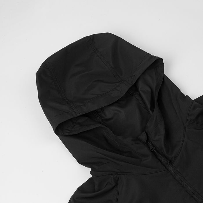 - Attached, adjustable, three-piece hood with a cinch-cord and cord lock on back